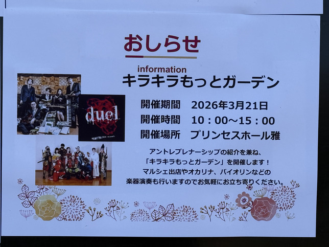 3月21日(土)10:00~14:00 可児市瀬田にあるワールドローズガーデン プリンセスホール雅で開催されたきらきらもっとの会主催の「きらきらもっとガーデン」に行ってきました。