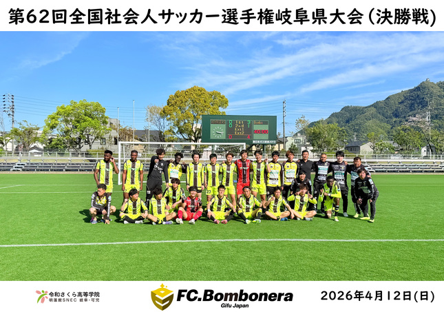 4月12日(日)13:30~ 岐阜市の長良川メドウ球技場で行われた第62回 全国社会人サッカー選手権岐阜大会の決勝戦に進んだボンボネーラの応援に行ってきました。