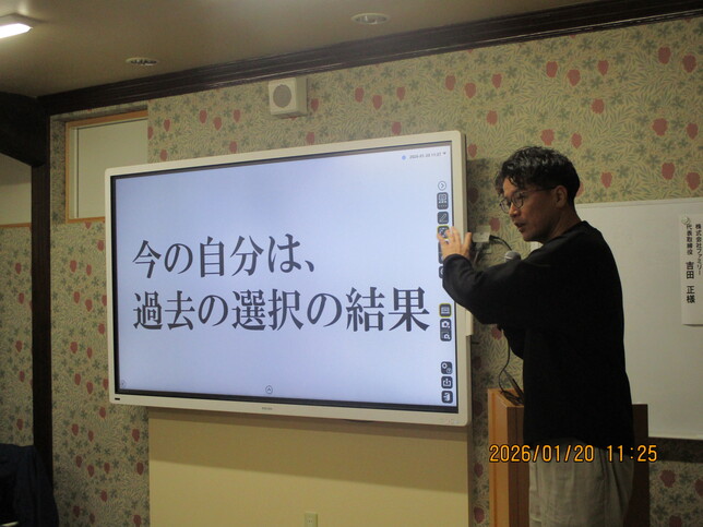 吉田社長様、公私ともにご多用の中、わざわざ足をお運びいただき、わかりやすくためになるご講話いただき、誠にありがとうございました。