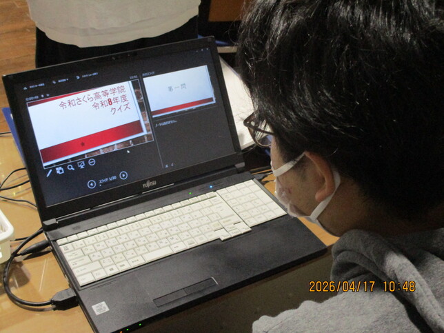 部活動紹介に続いて、生徒会役員の3年Oさんが作った令和さくら高等学院マニアッククイズが実施されました。