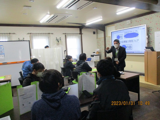 はじめに、店舗に入って、原山課長さんから、会社の概要から実際の仕事内容、キャリアアップの見通し、福利厚生の充実ぶりなど資料をもとに説明をしていただきました。