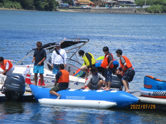 2日目の後半の活動は、サンセット桟橋から浜名湖に出てマリンスポーツ体験です。今回のマリンスポーツ体験は、昨年よりもバージョンアップし、クルージング、マリンジェット、バナナボート、マーブル、SAP、ボーディーボードの7種類を体験することができました。体験が進むにつれ、皆どんどんと意欲的になっていくのが、桟橋からも見て取れました。