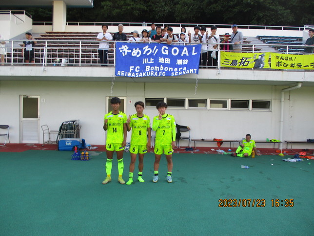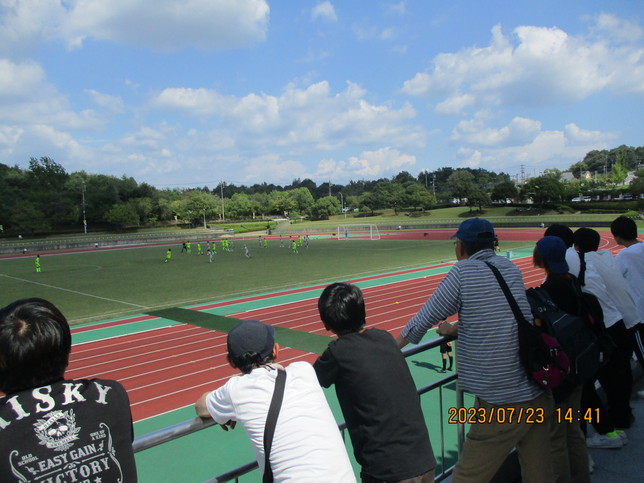 7月23日(日)夏休みに入った最初の日曜日、多治見市星ケ台陸上競技場で行われた東海社会人2部リーグ第12節、FCボンボネーラ対名古屋サッカークラブの試合を、教職員・生徒合わせて18名で川上コーチ、池田コーチ、浦谷コーチへの熱烈応援のために行ってきました。